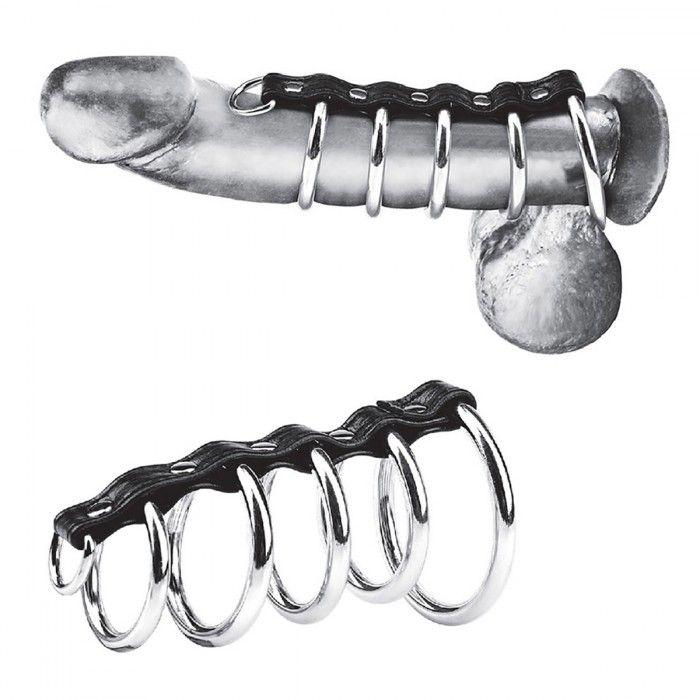 Хомут из черной эко-кожи с 5 стальными кольцами. Одно закрепляется за мошонкой, 4 остальных на пенис. Также есть кольцо для пристегивания других девайсов, например, поводка. Длина ремня - 12 см. Диаметр колец - от 3 до 5 см.