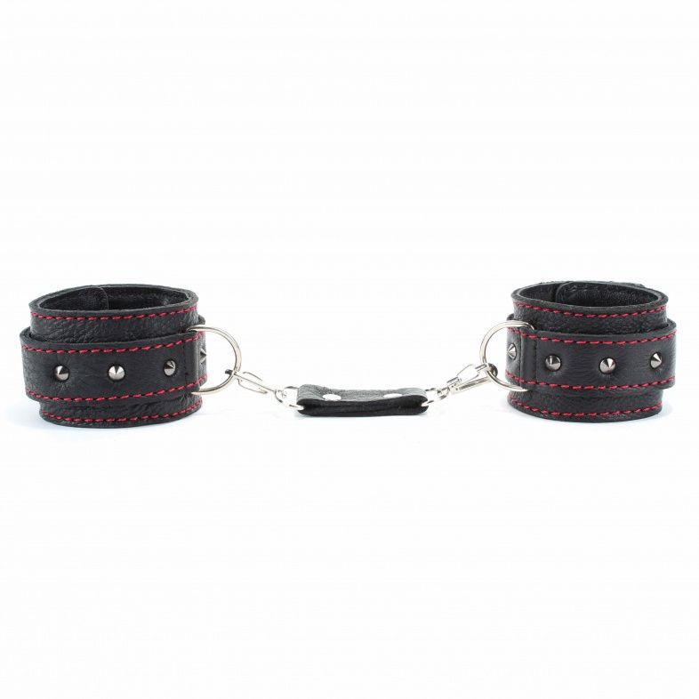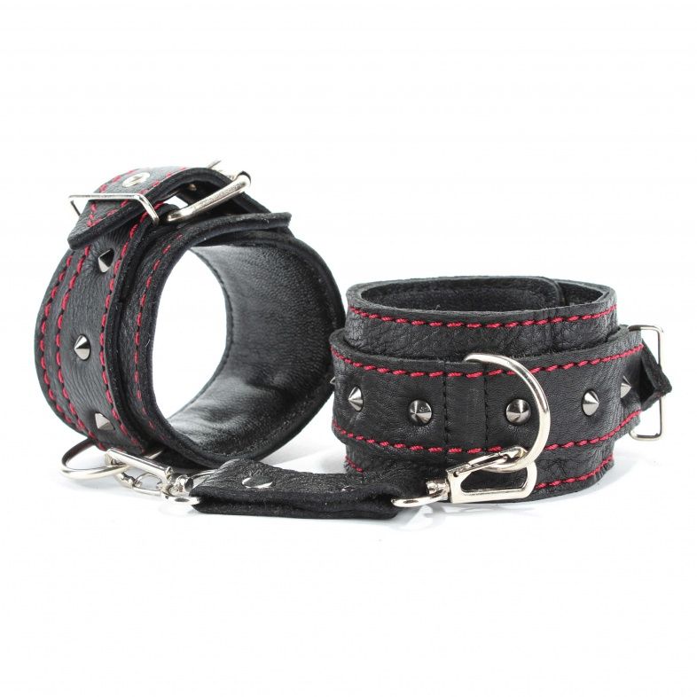 Оживить эротические игры Вам помогут поножи. Этот интимный аксессуар пользуется успехом. Выполненные в черном цвете с красной строчкой и украшены шипами. Модный интимный аксессуар не сдавливает и не нарушает кровообращение, так как изготовлен из мягкой кожи. Чтобы любимая никуда не убежала, поножи соединены короткой перемычкой. Длина перемычки - 6 см. Ширина оков - 5,3 см.