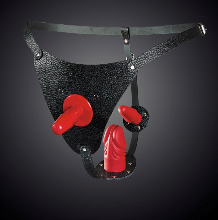 Трусики изготовлены из натуральной кожи. При производстве используется никелированная фурнитура. Размер регулируется ремешками, которые крепятся на бёдрах (от 42 до 50 размера). В комплект входит съёмный пластиковый плаг для насадок, съёмный фаллоимитатор, а также съёмная анальная пробка. Подходит для использования как мужчиной, так и женщиной. Длина съемного фаллоимитатора - 8 см., диаметр - 3,5 см. Длина анальной пробки - 8,5 см., диаметр - 2,2 см.